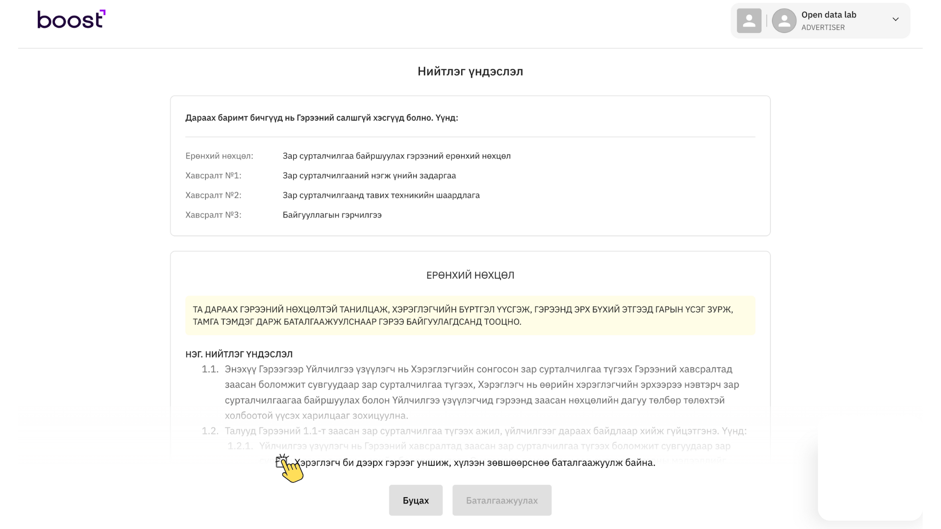 - Зар сурталчилгааны гэрээний нөхцөлтэй танилцаж, баталгаажуулна.