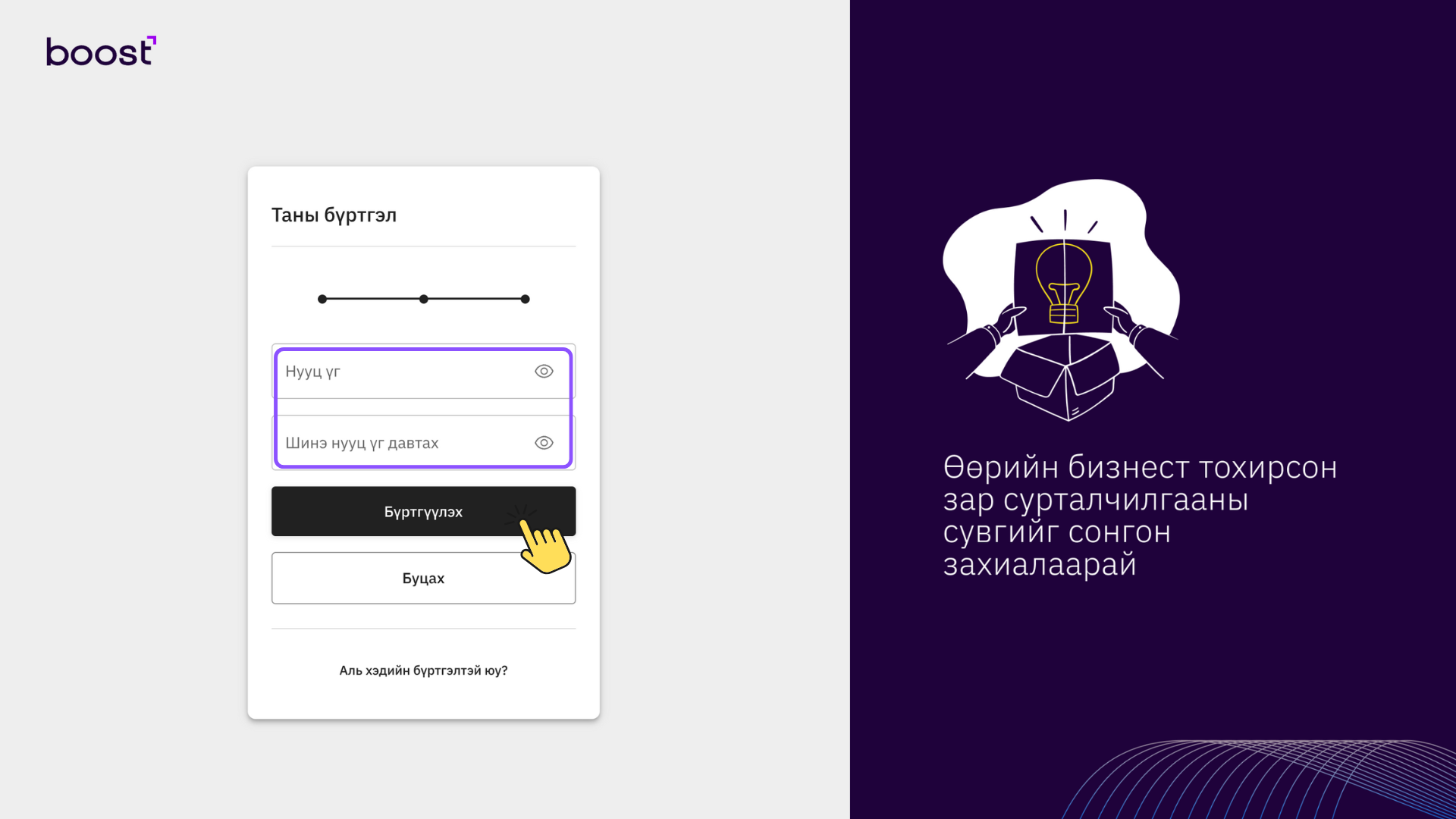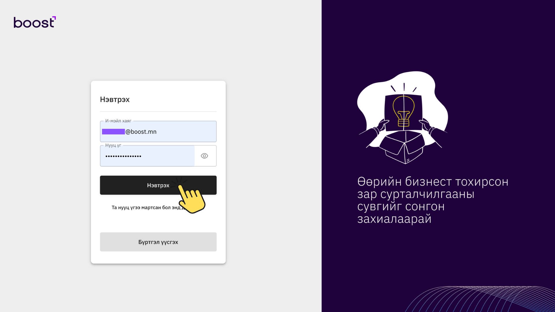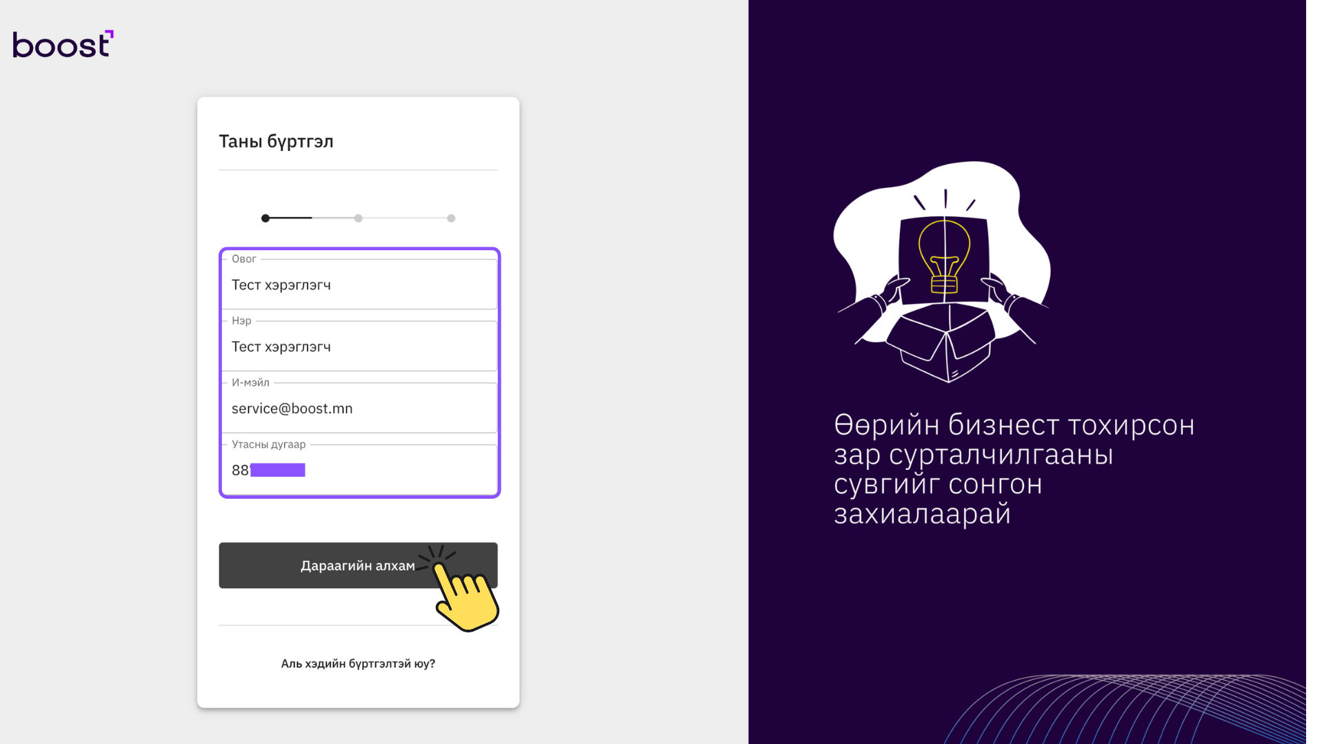 - boost.mn вэбсайтад зочилж “Бүртгүүлэх” товчийг дарна.