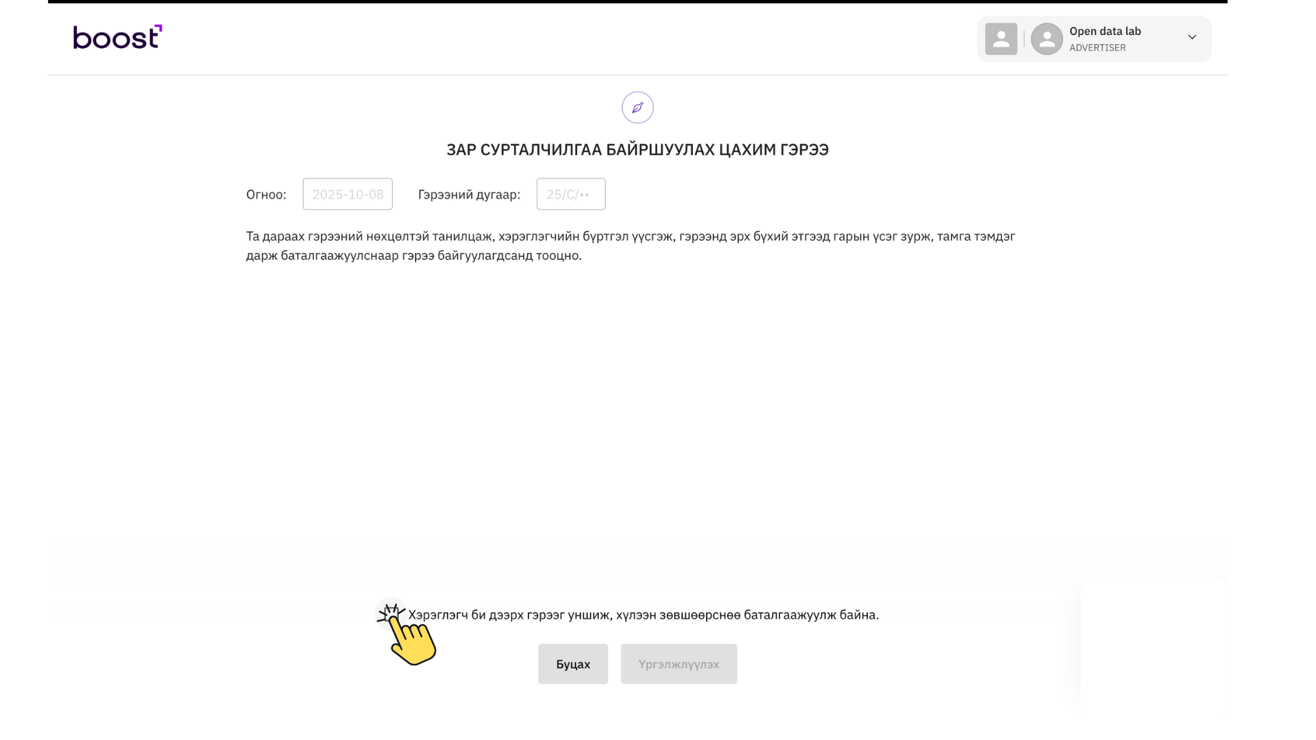 - Нэвтэрсний дараа, "Зар сурталчилгаа байршуулах цахим гэрээ"-г уншин танилцаж, “Үргэлжлүүлэх” товчийг дарна